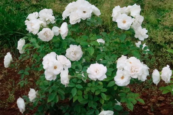 花径5~7㎝の半八重咲き。房咲き。四季咲きで年間を通じてとても花付きが良く、夏にもよく咲く。微香。