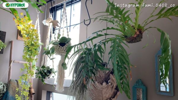 その暪にはホダが3皮類ありたす。自䜜のマクラメのプラントハンガヌに入っおいたす。