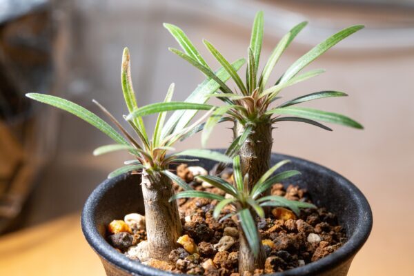 パキポディウム・ラメレイは、ヤシの木にも似た見た目をしているパキポディウムです。原産地はマダガスカルで、自生しているものは樹高6mほどに生長することもあります。