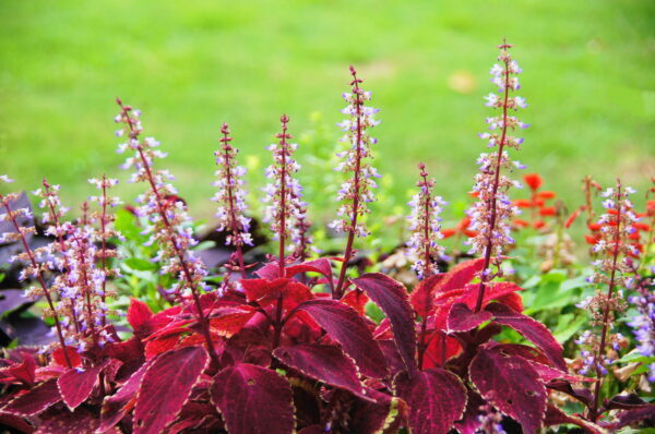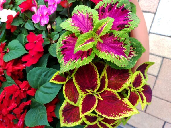 花壇やコンテナで、季節の草花とコリウスを合わせて植えることもおすすめです。コリウスには幅広いカラーがあるため、花との組み合わせを考えるのも楽しめます。