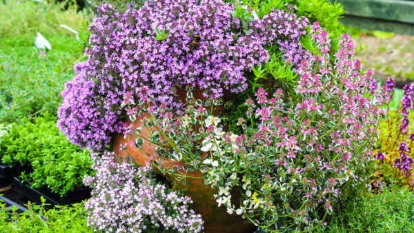 ほふく性のタイムは草丈がおよそ10㎝で這うように生長することから、グラウンドカバーとして用いられます。病気や害虫にも強いため、育てやすい植物として人気です。