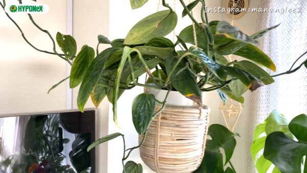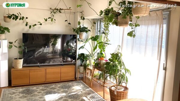 今回は、種類豊富なモンステラと、ハンギングした植物の長いつるが印象的なお部屋をご紹介します。
