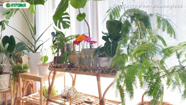 子供が走り回ってもぶつからないよう部屋の端にまとめたり、天井から下げています。つるが長く育った植物は、部屋中に這わせて育てています。