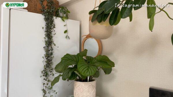 冷蔵庫の上に、ハートカズラとディスキディアオバタを置いています。つるが長いので、冷蔵庫から垂らすのが一番です。