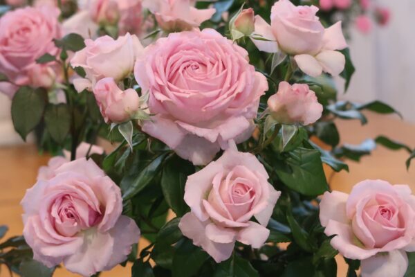 明るいピンクの大輪ロゼット咲き。花径10㎝。春花はアプリコットのニュアンスの入ることもある。明るい緑色の照り葉で、耐病性が高い。四季咲き。