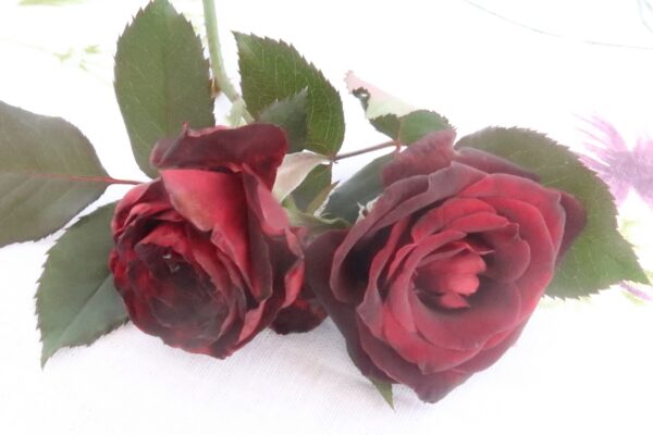 ベルベットのような光沢感のある黒赤色の剣弁咲き中大輪。花径9~10㎝。単花咲き。四季咲き。