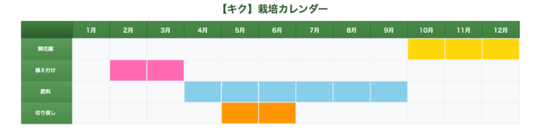 キクの植えつけは、4月~7月中旬にかけておこないます。秋咲に咲く品種は6月〜7月中旬までに植えつけを終えるようにしましょう。