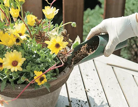 土入れを使って、苗の根鉢やコンテナとの隙間に土を加えていく。