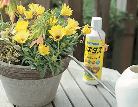 植物をよい状態に保つには、「害虫は早期発見、早期駆除」が鉄則。液肥のように水で薄めて株元に注ぎかける「ハイポネックス原液 殺虫剤入り」 なら、いつでも手軽に利用できます。