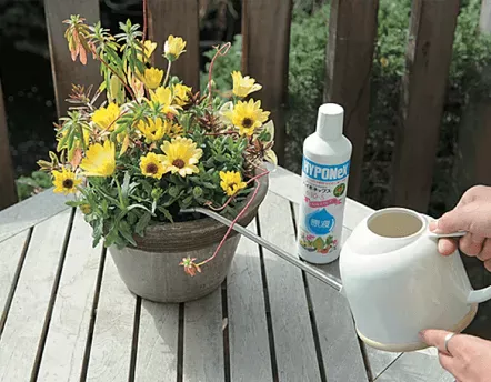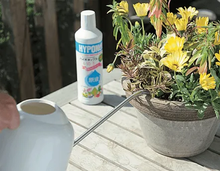 「ハイポネックス原液」で植物に必要な栄養を与えると、花色、葉色がよくなる。7 〜10日に一度の割合が目安。