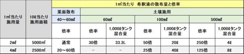 *土壌施用の場合:1m²当たりの施用量は2ml~4mlで、希釈液を1m²当たり60ml~500ml散布します。
