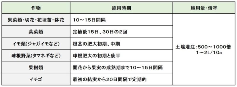 - カリを含み、果菜類や塊茎作物などに素早く吸収させ、カリ欠乏の予防や果実肥大に効果的です。