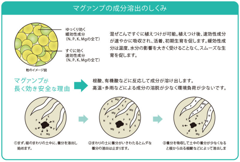 - 1回与えるだけで、植物の根から出る酸や土の中の微生物の