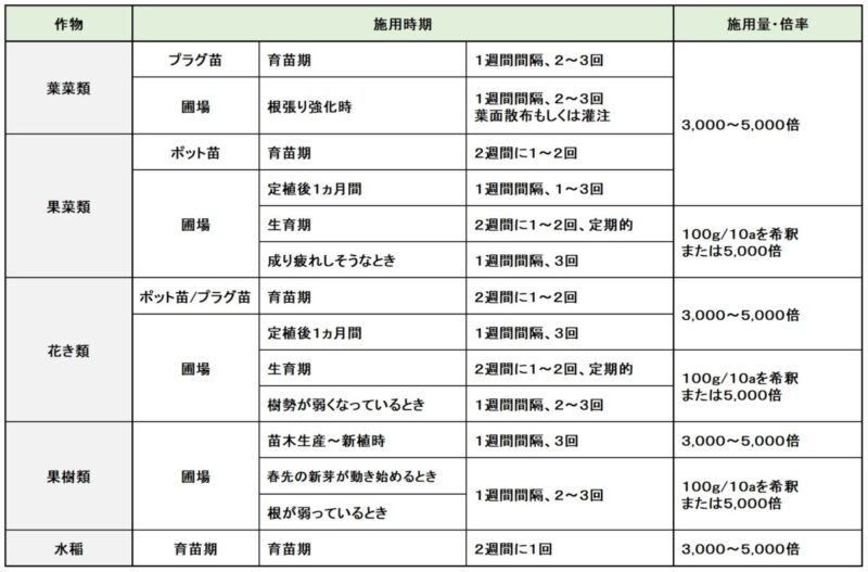 *施用量、施用間隔は目安のため栽培条件で変わることがあります。一度お試しのうえ、ご使用ください。