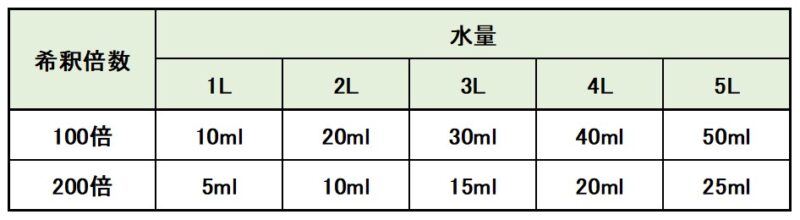 1600mlの水にキャップ1杯(8ml)で200倍にうすめてください。