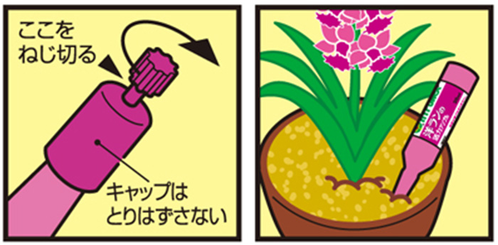 • キャップの先端をねじって切りはなし、株元から少しはなして、倒れない程度にさし込んでください。