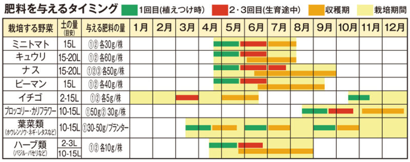 苗を植えつけた後に与えます。 種まきから始める時は土全体に混ぜ込んでから種をまいてください。 |