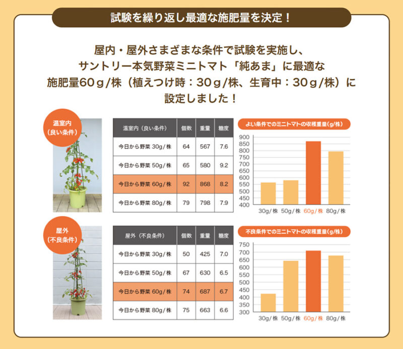 サントリフラワーズ株式会社の野菜苗でさまざまなパターンの栽培試験をおこない、もっとも相性のよい結果をもとに製品化し、「今日から野菜」シリーズが誕生しました。