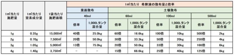 *根から吸収させる場合:1m²当たりの施肥量は1g~4gで、希釈液を1m²当たり60ml~1000ml散布します。1m²当たりのチッソ成分量は0.5gを目安にし、状況に応じて施肥量・希釈液の散布量を調整します。