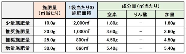 注意:施肥量は、芝生の種類、生育状態、気象条件、土壌、灌水方法などにより異なりますので、一つの目安としてお考えください。