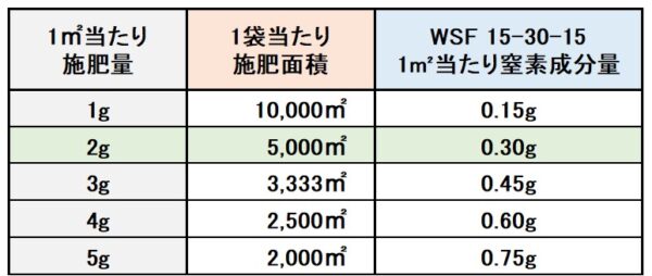 *葉面散布の場合:1m²当たりの施肥量は1g~3gで、希釈液を1m²当たり30~60ml噴霧します。