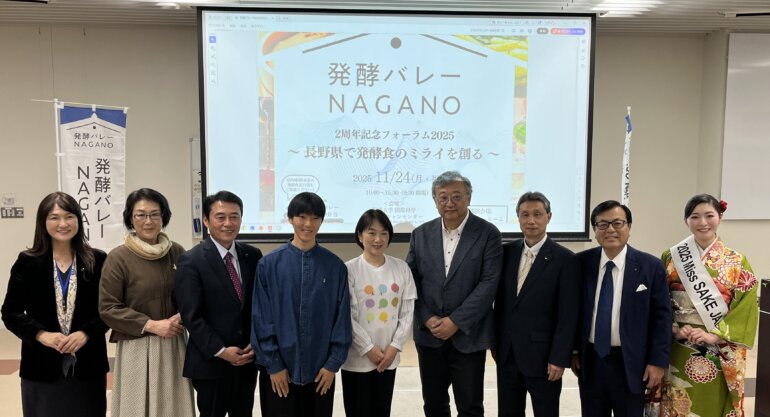 (左から)長野県議会 竹内議員、信州大学 香山副学長、長野県議会 風間議員、緒方湊、農林水産省 西大臣官房審議官、コープさっぽろ 大見理事長、長野県産業労働部 田中産業政策監、マルコメ株式会社 青木社長、2025 Miss SAKE Japan館農さん