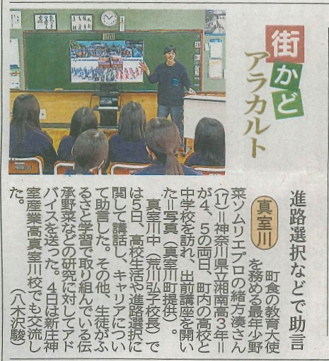 真室川町立真室川中学校を訪れ、全校生徒へのキャリア教育に関する講演の他、1年生は最上伝承野菜を伝えるということ、2年生は探求授業の研究サポート、3年生へは高校生活へ向けてのアドバイスなどを行いました。